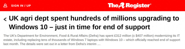 [环球网科技综合报道]11月6日消息,据TheRegister报道,英国环境、食品和农村事务部(Defra)近日披露,将投入3.12亿英镑推进IT系统现代化改造,其中核心内容包括将31500台搭载Windows7系统的笔记本电脑升级至Windows10系统。值得关注的是股票配资平台官网入口,微软已于上月中旬终止对Windows10系统的官方支持。